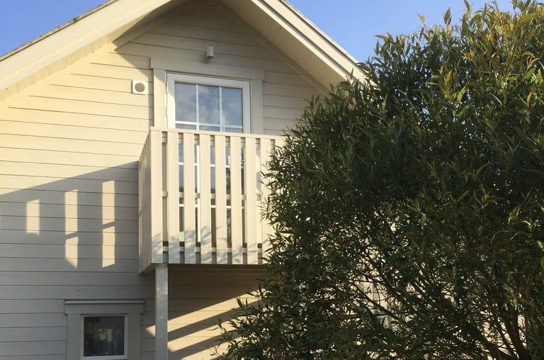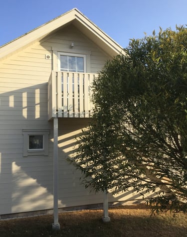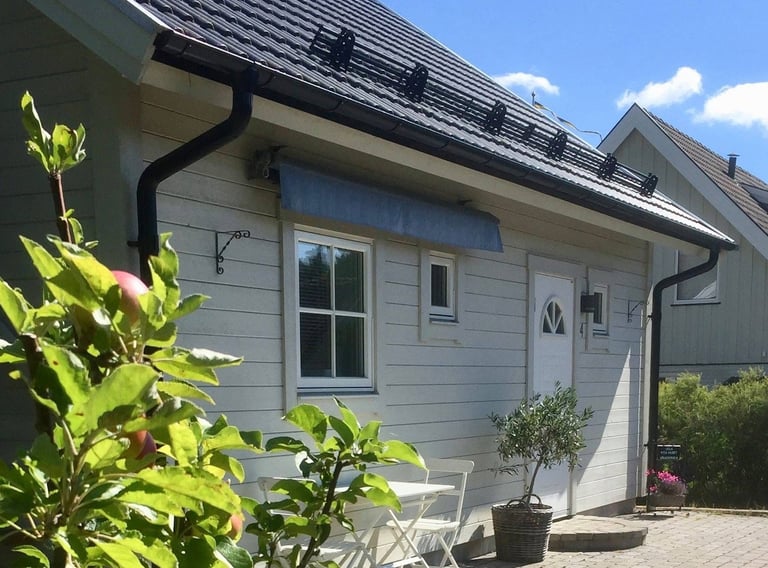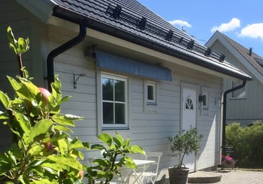Lilla vita huset har två våningar. Det finns parkeringsplats för 2 bilar, cykel, utemöbler, TV, wifi, kylskåp och mikrovågsugn.